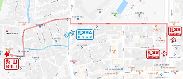 以下分別是公車「紅33」和「紅32A」下車站名及下車後走到登山口的路線