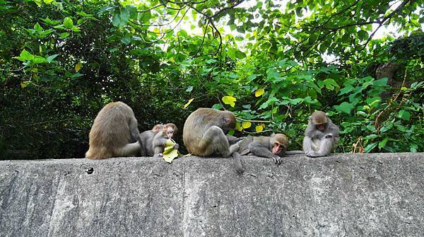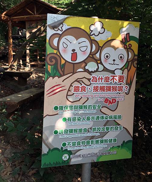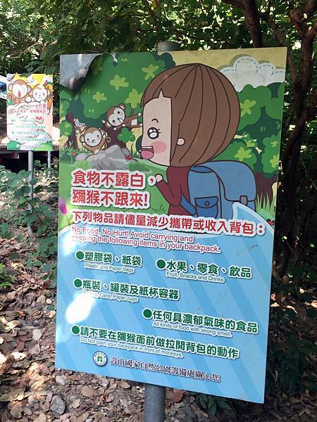 在爬山的過程沒意外的話都會遇見一群一群的獼猴家族,看到他們請特別注意上面的提醒事項喔,也請各位不要在他們面前揮舞棍棒類的東西,或是大幅度激烈的揮手之類的,這動作都有可能驚嚇到猴群,甚至會被他們視為挑釁、攻擊,可能因此引發不必要的衝突,我們靜靜的觀賞、與牠們和平共處才是最好的選擇。