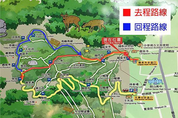 我們先來看看今天要教大家走的路線,從「龍泉寺步道口」開始,會經過「龍門亭」>「中心亭」>「雅座」>「猴區亭」>「泰國古」>「鳥瞰高雄」>「龍門亭」>最後回到「龍泉寺步道口」
