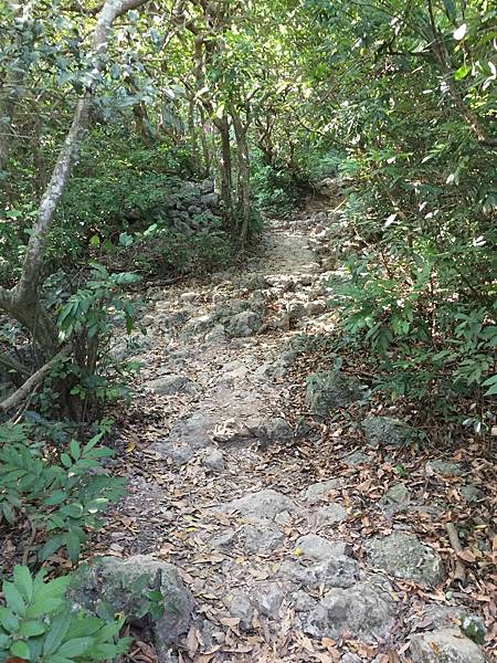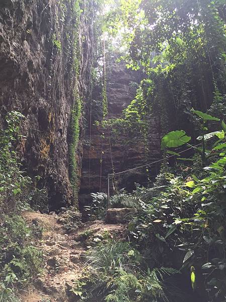 一直沿著小徑走會來到這個地方,有看到繩索嗎 ? 那裡有石梯,請拉著繩索繼續往上走。