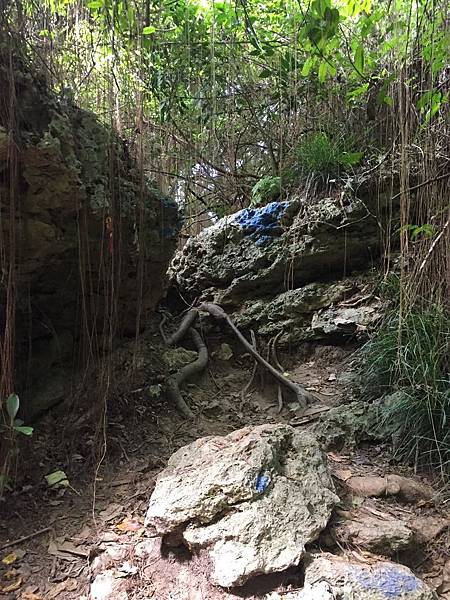 走上這些石梯後,請特別特別注意,再往下走沒幾公尺,就可以看到右手邊有個地方,石頭被噴了漆,如上圖,請越過上面那塊被噴了藍漆的石頭,越過它你就到了傳說中的「柴山神聖樹」。