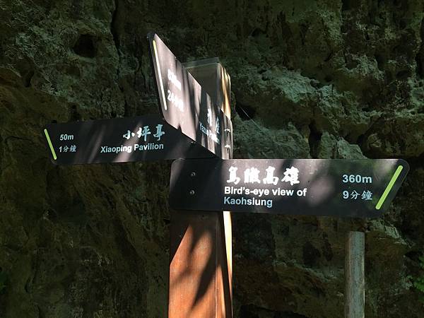 看完了「神聖樹」,我們回到原本的木棧道,繼續往下走會看到這牌子,我們往「鳥瞰高雄」前進。