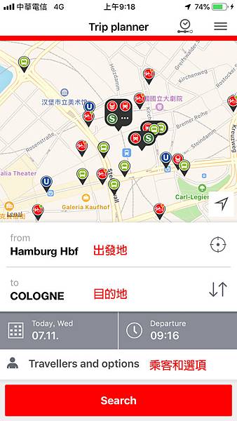可以看到,DB的首頁介面上方,有個即時地圖,方便你直接在地圖查看你附近的各種不同的車站(可隨意拖拉放大、縮小、移動 )此範例我查詢漢堡 - 科隆的班次資訊