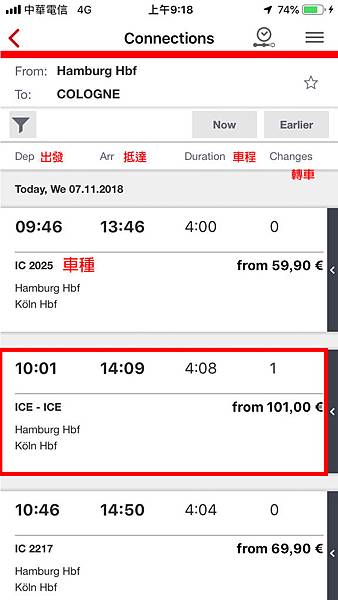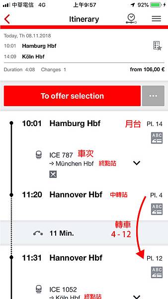 可以看到畫面中間顯示10:01 Hamburg Hbf的右邊有月台資訊 Pl.14(請務必注意月台資訊,以免搭錯車或錯過車...等),可以看到下方11:20要在Hannover Hbf轉車,由第4月台轉至第12月台,中間的轉車時間是11分鐘,也請各位在察看班次的時候,要特別注意是否有需要轉車,在哪裡轉車,轉車月台在哪裡,中間有多少時間 ...等,